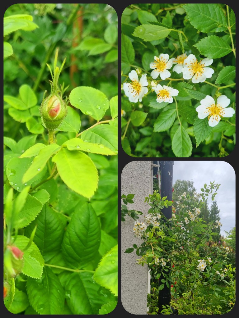 Bilden ovan föreställer vad vi i familjen har kallat Järborosen i alla år. Det kommer sig av att vi fick skott av denna av farbror Olles fru, Greta när vi var där och hälsade på i slutet på 90- talet. Det lilla skott jag fick med hem till Kyrkbyn fick sedan flytta med till Hudiksvall 2009. Uppenbarligen en stadsros, den växer nu så det knakar efter en ommöblering. Det som är lite roligt med den är att helt plötsligt för några år sedan började en enkelblommande vit ros dyka upp. Jag tror att det är en honungsros och var den kommer ifrån har jag ingen aning.