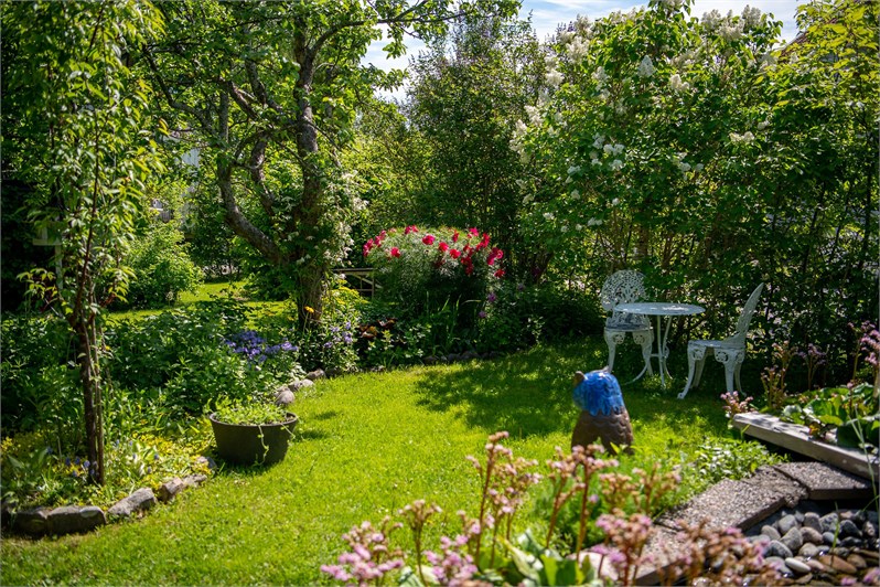Den trädgård vi lämnar över till någon annan är en riktig oas. Jag brukar säga att man kan i stort sett gå naken utan att någon ser en, avenbokhäcken som nu närmar sig fyra meter gör trädgården helt insynsskyddad. Fruktträden ligger som ett tak och alla buskar och häckar ger naturliga små krypin här och var.