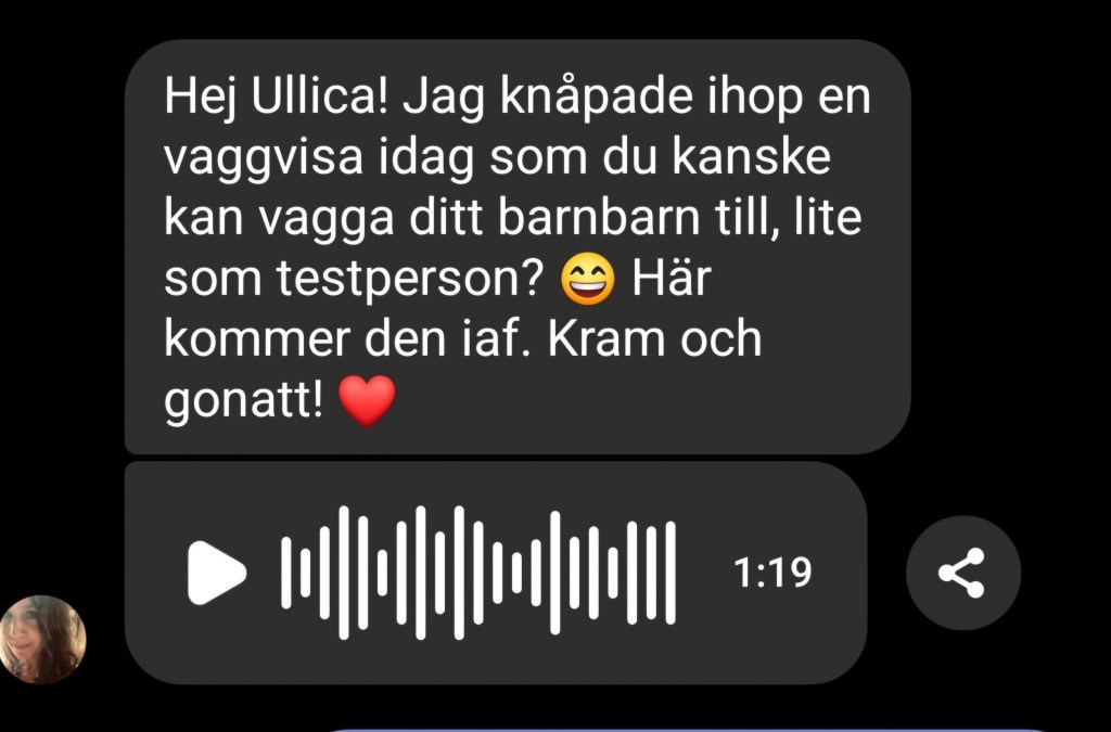 När jag ligger här i sängen och skriver lyssnar jag på hennes röst i hennes sånger som finns på Spotify. En sång hon skrev skickades till mig när Naela var bebis, hon ville att jag skulle vara testperson och ha denna när Naela skulle sova, det gjorde jag och Naela somnade så gott. 💜