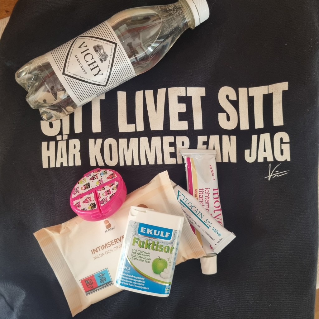 SĂ„ nu ska jag sova gott inatt trots osmorda hĂ€nder och armar som kliar efter duschen och i morgon bitti ska jag skutta upp tidigt för att ge kroppen ytterligare en bakteriedödande dusch och inte lĂ€gga pĂ„ lite mjukgörande krĂ€m och kanske lite fĂ€rg i ansiktet, utan Ă„ka helt naturell till GĂ€vle med mitt lilla vĂ€skapotek 😉