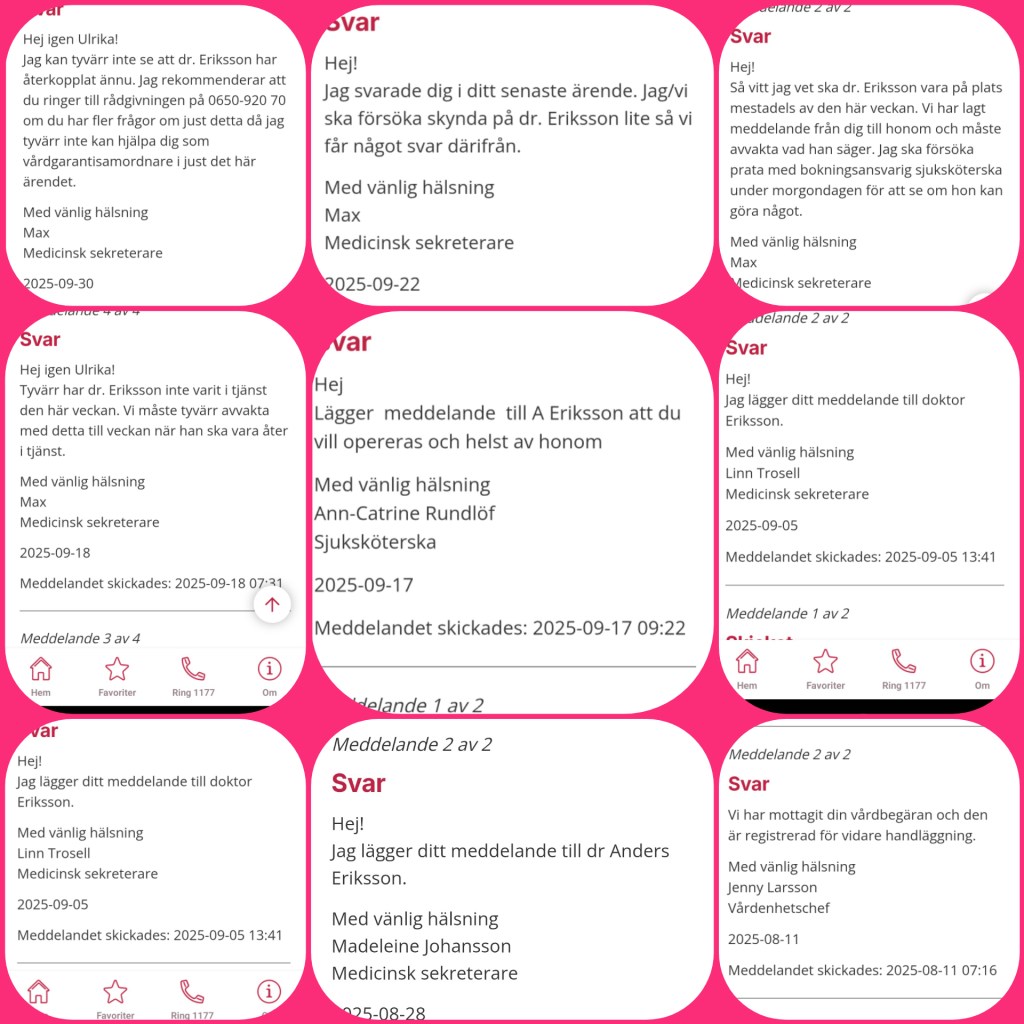 När dom till slut tröttnade på mig så hänvisade en sköterska till Vårdvägvisaren och jag skickade ett meddelande dit om situationen. I början fick jag bra respons förutom att alla svar blev att dom måste försöka nå läkaren. Denna kommunikation har nu pågått sedan augusti någon gång och det senaste svaret jag fick idag är att dom inte kan göra något utan hänvisar mig till att kontakta ortopeden direkt, dvs det jag har gjort hela sommaren. All förståelse att det varit semester, någon kan vara sjuk eller ledig av andra orsaker, men ingen har något besked att ge förutom min läkare och han lovade mig att lösa detta bara jag ordnade fram ett klartecken från onkologen, vilket jag meddelade i början på augusti. Nedan väljer jag att lägga in delar från de svar jag fått i kontakten med dem, alla med samma svar….