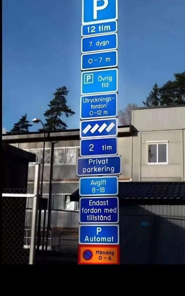 Jag hittade en bild för ett tag sedan och någonstans så känner jag som att jag står framför denna och ska lista ut var jag ska parkera. Jag vet inte vem jag är förutom sjuk, jag vet inte hur jag ska få hjälp med foten, jag vet inte hur jag mår efter strålningen och jag känner inte igen min kropp. Om jag verkligen skulle ha stått och betraktat denna skylt i hopp om att förstå dess innebörd, då vet jag att jag helt enkelt skulle leta upp en annan parkering, det vore det enklaste att göra.🙃