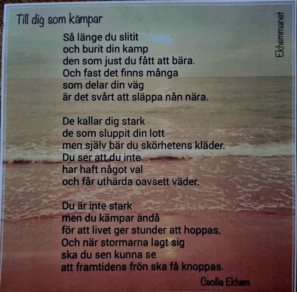 Eftersom detta inlägg handlat mycket om vänskap så känns det fint att visa detta fina kort jag fick från en av dessa ”nya” vänner som jag fick förmån att lära känna när hon gick igenom något mycket mera tufft än sjukdom, den enorma förlust av en människa på grund av en annan persons handlande. Tack Carina, du är en av personer som alltid kommer att finnas där, inte varje dag, men alltid i närheten på något sätt 🙏 du vet vad jag menar 🍂🍁🍂