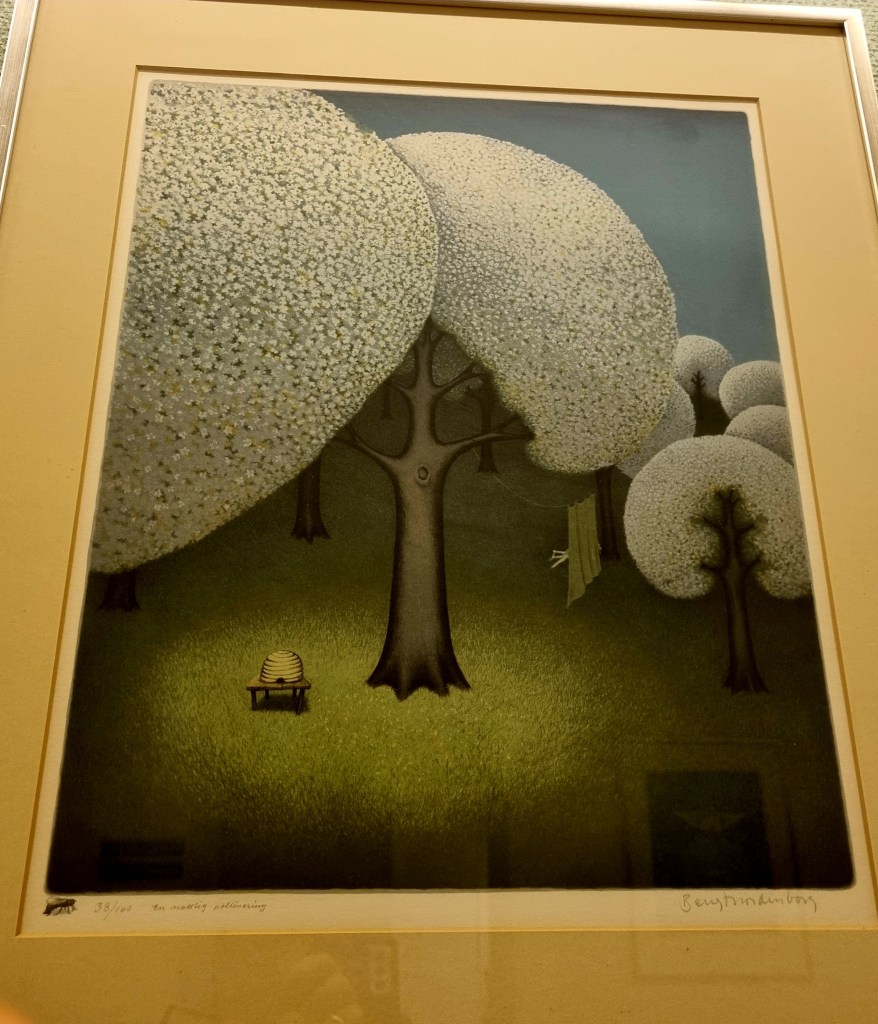 Vill ändå ge er denna tavla, många har säkert knappt lagt märke till den, lite dov i färgerna, kanhända lite småtråkig, men då måste man titta närmare för att se vad som man endast kan ana. Den heter Pollinering och hänger på en av väggarna i Bröstmottagningens korridor.