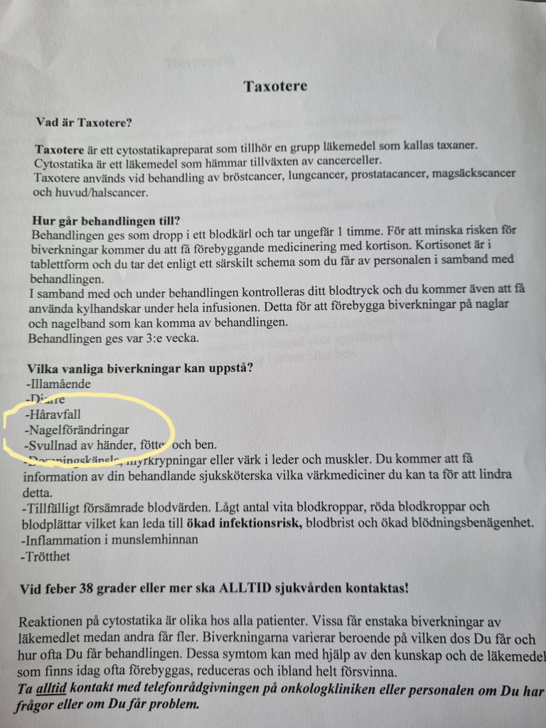Så den 1 oktober, efter olika undersökningar så fick jag det klara beskedet från en kirurg. Jag kommer mest ihåg kirurgens svar på min ängsliga fråga ”Kommer jag att tappa håret?” och hennes korta svar var ”Ja, det kommer du att göra” samt när hon berättade att mitt bröst mest troligt skulle opereras bort så sa jag att då får ni ta bort båda och hon replikerade –” Det ska vi bli två om”.