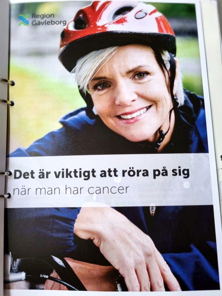 Denna broschyr får man med sig i pärmen efter att cancerdiagnosen är konstaterad: ”Det är viktigt att röra på sig när man fått cancer”