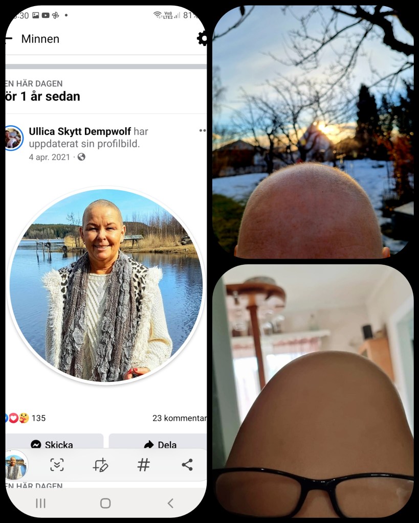 Tovor i håret! Vilken upplevelse när kammen fastande i håret en morgon. Jag insåg i vinter att jag måste börja kamma håret, det har blivit krulligt och med hjälp av Yvonne så har jag hittat en bra toning som gömmer det helt säkert gråa stråna som gömmer sig därinne. Jag har smort in håret med olja varje morgon och en kräm som inte gör det så frizzigt, så just nu har jag helt otroligt löjliga lockar över hela skallen. Senast jag hade den frisyren var jag i treåårsåldern och rödhårig. Detta med oljan gör det mjukt men som sagt en dag tog det stopp med kammen och jag fastande rejält i en tova och jag blev först förvånad men sedan glad. Jösses, förra året vid den här tiden var det endast några millimeter. Kan ju inte påstå att jag varje morgon är lycklig när jag möter min spegelbild, jag ser att jag gått igenom något, men samtidigt så har jag givit mig tusan på att inte låta den här jäkla sjukdomen knäcka mig. Försöker att vända allt till positivt, kroppen har ju fått tagit en hel del stryk och tar det fortfarande. Några av alla kilon jag tappade i början har kommit tillbaka, men stannat vid en behagligare nivå. Alla mina naglar har tagit stryk och givit mig nageltrång på stortårna och fragilitet på alla övriga. Jag kan inte öppna en konservburk utan att använda redskap och jag kan inte använda de skor jag vill. Min mage fungerar inte som den ska, toabesöken är snabba men jobbiga om man så säger. Slemhinnorna som vi alla är beroende av är till viss del undermåliga, näsan rinner mer eller mindre konstant och nedre regionerna är inte så trevliga heller. Detta är baksidan av min sjukdom/behandling, det som jag inte alls kunde ana när jag fick första dos cytostatika/antikroppar den 8 oktober 2020. Tyvärr är det också sådant som i skriften man får i början benämns som något underordnat, något bagatellartat. Men det påverkar ju kroppen dygnet runt. Jag trodde i min enfald att det låg något i ordet cancerrehabilitering, men tji fick jag, detta existerar inte inom Regionen. Jag är egentligen inte beviljad Medicinsk fotvård för mina besvär, min onkolog får inte skriva en remiss för detta. Tack och lov hade jag förmånen att få respons på en egen vårdbegäran till fotvården och underbara Lena hjälper mig när jag behöver. Det tar ungefär 10 minuter för henne att fixa mina tår för någon/några veckor framåt, jag kan då gå som en normal människa. Jag har försökt att genom egen vårdbegäran få komma till en gynekolog, men alltid fått åter ett svar om att prova ditten och datten för mina besvär och med orden ärendet avslutat. Nu verkar det som om onkologen ska kunna ge mig den remissen i varje fall, det får jag väl dock se, när jag nu får träffa honom. Just nu och i framtiden så får jag en kallelse till röntgen var tredje månad, efter denna ska jag få träffa min läkare för att få ett besked om hur det ser ut med metastaser osv och framtida behandlingar. Sist jag träffade honom var i september och egentligen skulle jag fått ett möte i december, men detta uteblev, dock blev jag lovad ett fysiskt besök runt vecka 10 men det blev heller inget. När jag nu kollade 1177 så har det skickats ett brev om min status i nuläget. Tack och lov ser det bra ut men jag har ju hur många frågor som helst som jag skulle vilja ställa, om framtiden och kommande behandling av Zometa som kräver utdragning av två tänder och mycket annat. Tyvärr har jag hört att onkologen i Gävle är överhopade av patienter och då är det väl något man ska ha förståelse för, det finns människor som är mer drabbad än vad jag är, dom behöver prioriteras, men ändå. Jag har tankar som jag behöver räta ut innan dom blir det där nystanet som goda vännen Carina beskrev häromdagen. Tankar som under lång tid får trassla in sig i varandra tar lång tid att räta ut igen. De liksom rötterna på ett träd rotar sig i hjärnan. Nog om detta nu, hör får ni några bilder på hårresan jag har gjort under dessa arton månader. Till er som drabbas utav något liknande, hår är bara hår, men det gör ont nät det faller, dock så kan man försöka utnyttja tillståndet. Jag valde att använda det till något som förändrade mig till någon starkare. Kanske har jag skrivit om detta tidigare, men då får det bli en upprepning. Jag utmanade mig själv en dag förra vintern, satt som många gånger tidigare på Coops parkering och tittade på folk, nöjen i coronatider. En bil parkerade bredvid mig och jag kikade på mannen som var i min ålder och lika skallig som jag. Han klev ur bilen och gick in i affären, utan någon tvekan. Då bestämde jag mig, rev av mig turbanen och strosade sedan runt på Coop i nästan en timme bara för att utmana mig själv och blickarna. Där och då bestämde jag mig för att fullkomligt strunta i hur jag såg ut. Det var skönt!